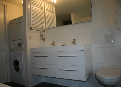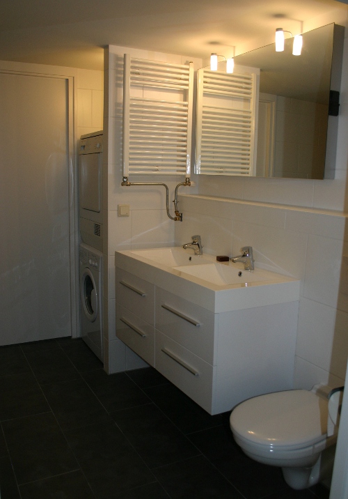 Het toilet, een dubbele wasbak met grote verlichte spiegel en ernaast een wasmachine en wasdroger.