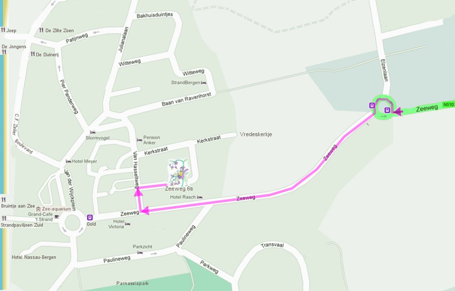 Als u Bergen aan Zee inrijdt krijgt u direct een rotonde. Ga hier rechtdoor (de 2e afslag) en rij 500 meter.